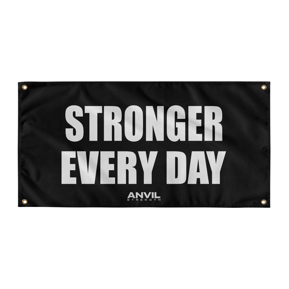Pink banner with 'Stronger Every Day' text in a gym setting. Motivational gym flag banner.